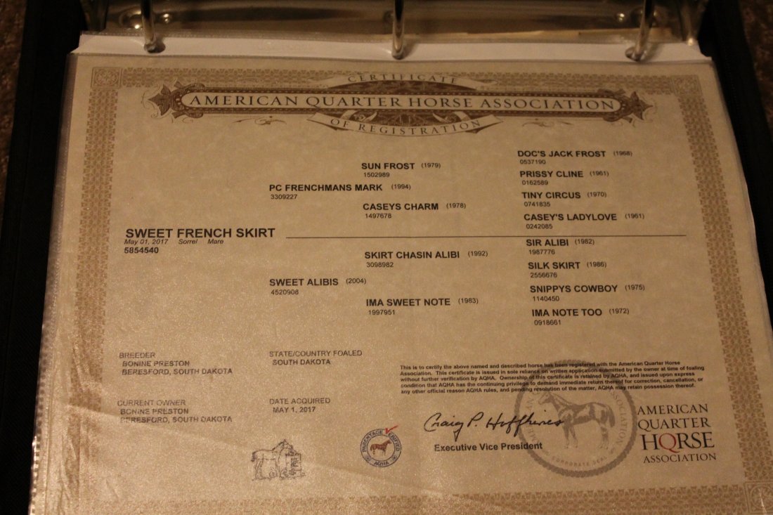 Super nice filly. She is paid in full to Future Fortunes. Her sire is PC Frenchmans Mark, FULL brother to Bozo and Dinero. PC Frenchmans Mark has sired an AQHA World Champion, PRCA money earners, WPRA money earners, and is the grandsire to a WPRA Futurity World Champion. This filly's dam is Sweet Alibis. Sweet Alibis is also the dam to Barts Blu Jeans. We are offering this filly for sale. (I apologize for her haircoat in these pictures. I am hoping to take new pictures soon.)